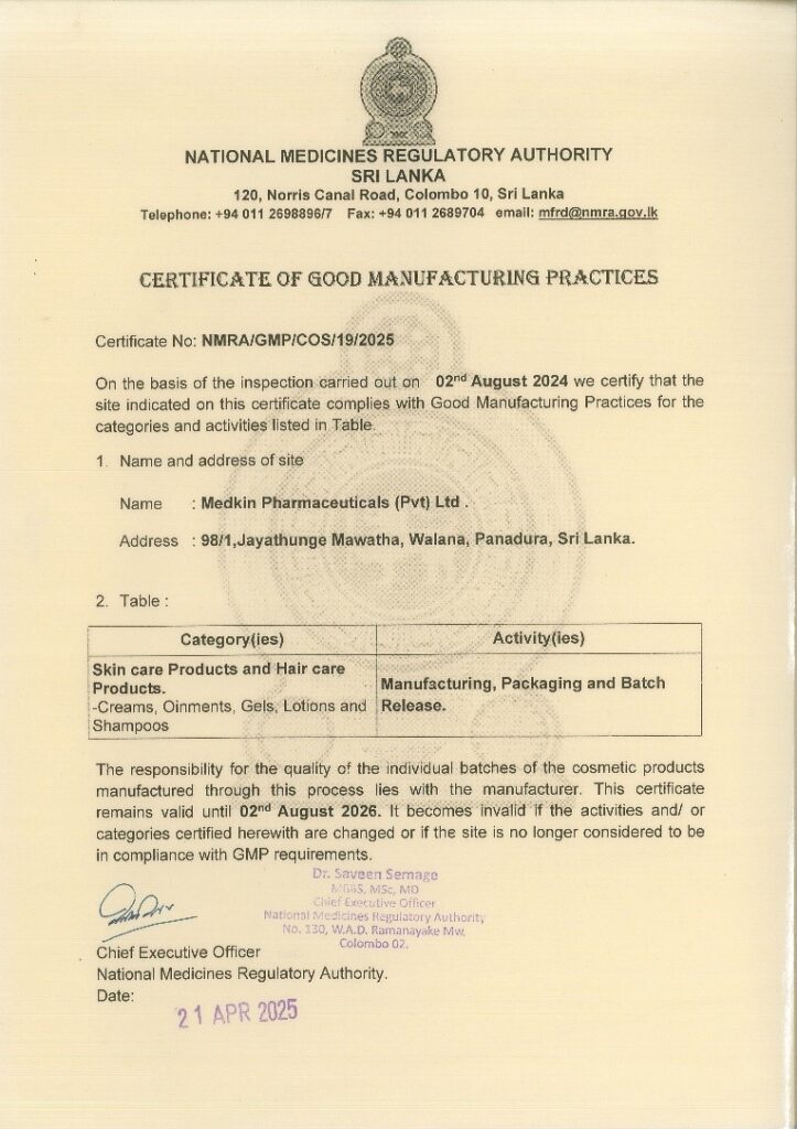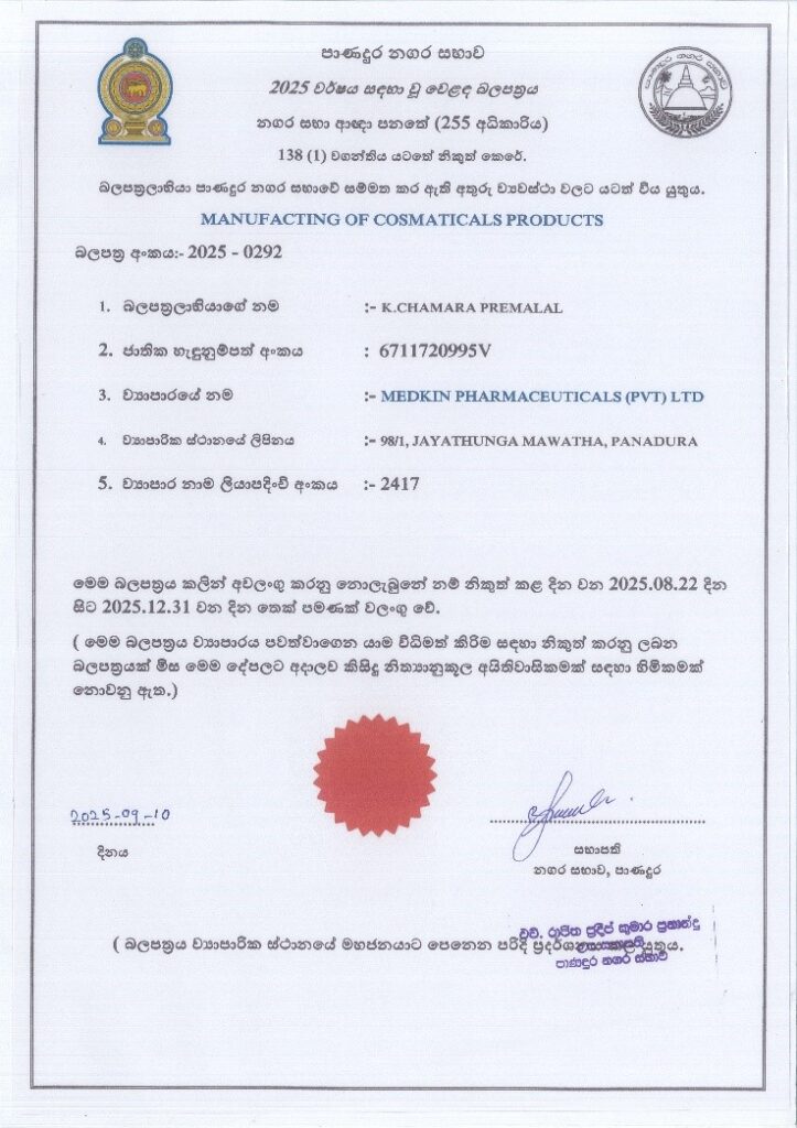 Medkin Pharmaceuticals (Pvt) Ltd, based in Panadura, Sri Lanka, is a trusted manufacturer of cosmeceuticals, herbal cosmetics, and herbal veterinary products. Since our inception, we have been dedicated to developing safe, innovative, and high-quality formulations that blend the wisdom of traditional herbal medicine with the precision of modern science.